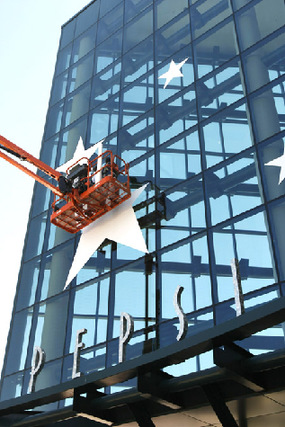Workers install stars outside the Pepsi Center, site of the Democratic National Convention in Denver, Colorado August 22, 2008. The convention starts Monday August 25. [Agencies]