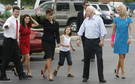 US Republican presidential candidate Senator John McCain and his wife Cindy (R) head in for a shopping trip at The Buckeye Corner in Columbus, Ohio, with running mate Alaska Governor Sarah Palin (3rd L), her husband Todd (L) and their daughters Piper (3rd R) and Willow (2nd L) August 29, 2008. [Agencies]