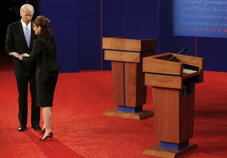 Democratic vice presidential nominee Senator Joe Biden (D-DE) and Republican vice presidential nominee Alaska Governor Sarah Palin (R) shake hands before the start of the vice presidential debate at Washington University in St. Louis, Missouri, October 2, 2008.[Agencies]
