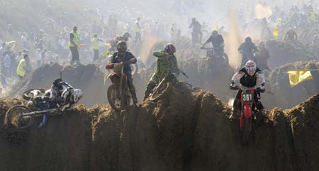 Motorcyclists compete in the solo mass race at the Weston Beach Races in Weston-Super-Mare in southwest England October 12, 2008. The annual off road endurance race is the largest of its type in Britain and over 1,000 riders race for three hours on the beach-built course to decide the winner.[Agencies]