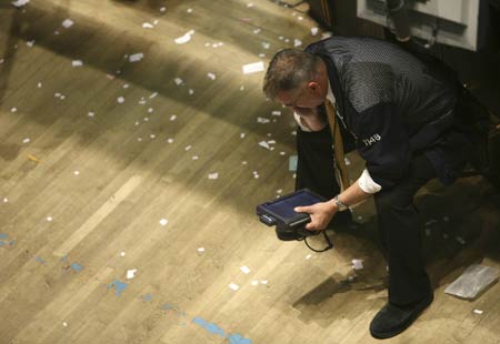 A trader works on the floor of the New York Stock Exchange, October 15, 2008. US stocks tumbled on Wednesday as bleak economic data fed worries that all the efforts to unlock credit markets may not stave off a severe recession. [Agencies]