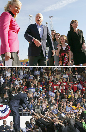 The combo shows US Republican presidential nominee Senator John McCain (above) is joined onstage by his wife Cindy (L), US Republican vice-presidential nominee Alaska Governor Sarah Palin at a campaign rally in Green, Ohio and US Democratic presidential nominee Senator Barack Obama (below) greets supporters as he arrives at a campaign rally in Richmond, Virginia. [Agencies]