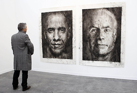 A visitor stops to look at artist Yan Pei-Ming's watercolour on paper, "US Election: Obama/McCain 2008" on the eve of the opening of the FIAC 2008 contemporary art show in Paris October 22, 2008. [Agencies]