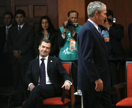 Russian President Dmitry Medvedev looks up as US President George W. Bush passes by during a leaders retreat meeting at the Asia-Pacific Economic Cooperation (APEC) summit in Lima, Peru November 23, 2008. [Agencies]