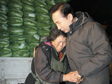 South Korean President Lee Myung-bak (R) hugs a street vendor selling outer leaves of cabbage, who was weeping as she saw Lee visiting a market in Seoul in this picture taken early December 4, 2008 during a photo call. [Agencies]