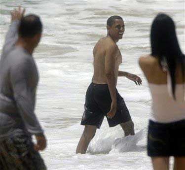 In this Aug. 14, 2008, file photo people on the beach call out to Democratic presidential candidate Sen. Barack Obama, D-Ill., as he heads back into the water while body-surfing in Honolulu, Hawaii. [Agencies]