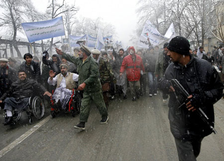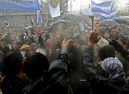 Afghan protesters shout slogans during a march against Israel's air offensive in Gaza, in Kabul, January 3, 2009. [Agencies]