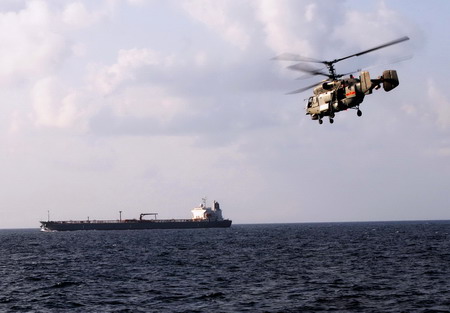 A helicopter of the Chinese navy flies over sea waters off Somalia during an escort duty in Somali waters January 12, 2009. The navy guided four merchant vessels, the Zhenhua 13 and Zhenhua 14 from Shanghai, Yushan from Taiwan and the China-registered Filipino ship Saga Horizon, the mission's headquarters said Monday. [Xinhua]
