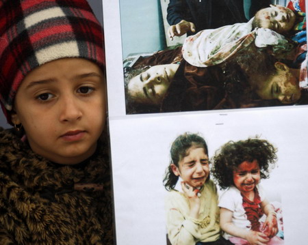 A Jordanian girl sits next to pictures during a demonstration to show her solidarity with Palestinians in Gaza, outside the Jordanian parliament in Amman January 18, 2009. [Agencies]