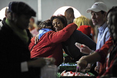 Michelle Obama (C), the wife of US President-elect Barack Obama, gets a hug as she celebrates National Day of Service by helping volunteers assemble care packages for US troops overseas for "Operation Gratitude" in Washington, January 19, 2009. [Agencies]