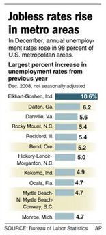More than 100,000 job cuts have been announced since then by a wide range of industries, sparing few communities. The government's next monthly snapshot of nationwide unemployment is expected to show the January rate climbed to a 17-year high. "It used to be they'd at least take your application. They don't even do that any more," said Heather Allen of Elkhart, Ind., an area that had the biggest annual gain in its unemployment rate. "Places just aren't hiring." The recession, now in its second year, was caused by the housing, credit and financial crises. To survive, companies are eliminating jobs and cutting or freezing pay, among other cost-saving measures. Layoffs were announced Wednesday by Botox maker Allergan Inc. and Time Warner Cable Inc., which cut a combined 1,700 workers. "Industries that at first appeared to be immune to downturns, such as computer and pharmaceutical, are now rapidly shedding workers," said John Challenger, chief of Challenger, Gray & Christmas, a placement firm. President Barack Obama and Congress are negotiating a nearly $900 billion package of tax cuts and government spending intended to pump-up consumer spending and create jobs. Even if it is quickly enacted, unemployment will keep rising and the country as a whole probably will lose up to 3 million jobs this year, economists predict. "Unfortunately, there is no light at the end of the tunnel yet," Challenger said. Jobless rates climbed in 363 of 369 large metropolitan areas in December, compared with the prior year, according to Wednesday's Labor Department report. Indiana's Elkhart-Goshen region saw its unemployment rate soar to 15.3 percent in December, up a whopping 10.6 percentage points from December 2007. The region has been bruised by layoffs in the recreational vehicle industry. Hundreds of workers have lost their jobs at RV makers such as Monaco Coach Corp., Keystone RV Co. and Pilgrim International. Allen, a 35-year-old mother of two, said she began looking for a job in September when her husband's hours at Monaco Coach were cut sharply — including some weeks where he's told not to show up for work. Prospects are dim. "We've done some diversification over the years, but not enough to offset what has happened in the RV industry," said Elkhart County Commissioner Terry Rodino. Dalton, Ga. — home to many flooring manufacturers and nicknamed the carpet capital of the world — racked up the second-largest increase. The region's unemployment rate jumped to 11.2 percent, up 6.2 percentage points from a year earlier, as fallout from the housing market's collapse has cut demand for carpets and other household goods. Danville, Va., which saw its jobless rate bolt to 11.5 percent, had the third-biggest increase of 5.6 percentage points. The area's economy once relied primarily on the tobacco and textile industries and has not yet recovered, interim City Manager M. Lyle Lacy III said Wednesday. Rocky Mount, N.C., and Rockford, Ill., tied for the fourth-largest gain. The nationwide unemployment rate climbed to 7.2 percent in December. Government data to be released Friday are expected to show the rate rose to a seasonally adjusted 7.5 percent in January — a 17-year peak. The number of people collecting jobless benefits also is climbing to record highs. A Thursday report is expected to show the country's jobless benefits rolls hitting 4.8 million. Many of the highest jobless rates were concentrated in California, which got walloped after the booming housing market went bust. The state also has one of the highest home foreclosure rates in the country. El Centro, Calif., continued to lay claim to the nation's highest unemployment rate — 22.6 percent. The jobless rate is notoriously high in the area, where many unemployed are seasonal agriculture workers, including some who live in Mexico. Among the few bright spots in the government unemployment report were the metro areas that include Morgantown, W.Va., — home of West Virginia University — and Logan, which straddles Utah and Idaho. They registered unemployment rates of 2.7 percent and 2.8 percent, respectively. The metropolitan area unemployment figures aren't seasonally adjusted. |