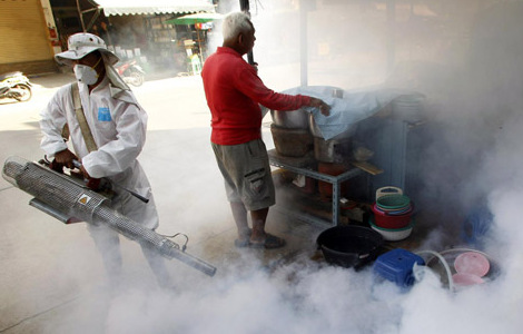 A health worker fumigates a housing development after floodwaters receded in Nonthaburi province, on the outskirts of Bangkok Dec 14, 2011. [Photo/Agencies] |