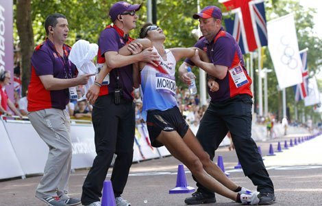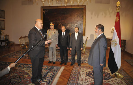 Egypt's President Mohamed Mursi (R) observes as newly appointed Vice-President, Judge Mahmoud Mekki receives his orders at the presidential palace in Cairo, August 12, 2012. [Photo/Agencies] |