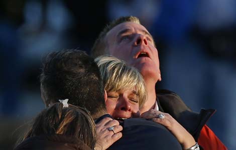Donna Soto, the mother of teacher Victoria Soto, who was killed at Sandy Hook Elementary School, leans on her son Matthew at a candlelight vigil on Saturday in Stratford, Connecticut. A gunman massacred 20 children and six staff members at the school on Friday. Photo by Jared Wickerham / Agence France-Presse |