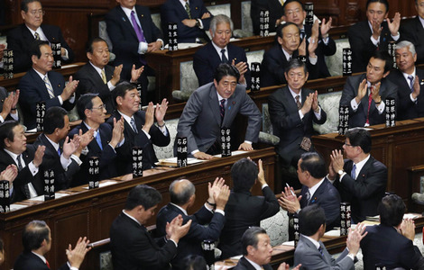 The leader of Liberal Democratic Party (LDP) Shinzo Abe (C) is applauded by his party members after being elected as Japan's Prime Minister at the Lower House of the Parliament in Tokyo Dec 26, 2012. [Photo/Agencies] |
