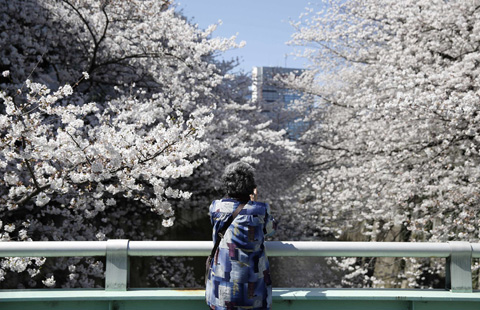 A woman and a man look at cherry blossoms in full bloom in Tokyo March 31, 2014. Many people enjoy viewing the blossoms all over the country during this season. [Photo/Agencies]