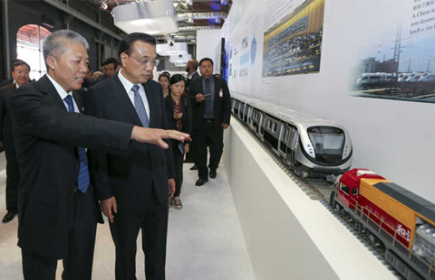 Chinese Premier Li Keqiang, center, pays a visit to the Chinese Equipment Manufacturing Industry Exposition in Rio de Janeiro in Brazil on May 20, 2015.