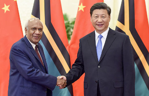 Chinese President Xi Jinping met on Tuesday with Vanuatu Prime Minister Sato Kilman in Beijing, vowing to keep offering the South Pacific country economic and technical aid as it recovers from being hit by a cyclone in March.