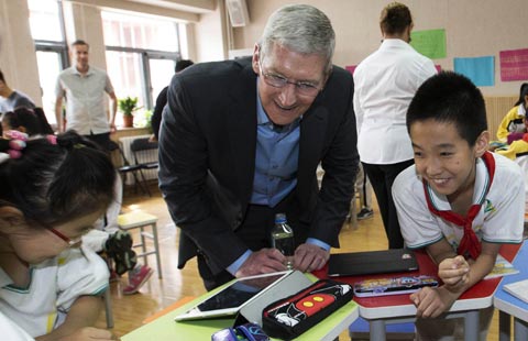 Tim Cook, CEO of Apple Inc, talks with students in a digital education class at the primary school affiliated with Communication University of China in Beijing on Tuesday.