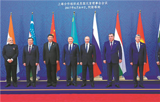 President Xi Jinping joins leaders for a group photo on Friday at the summit of the Shanghai Cooperation Organization in Astana, Kazakhstan. They are, from left, Indian Prime Minister Narendra Modi, Uzbekistani President Shavkat Mirziyoyev, President Xi, Kazakhstani President Nursultan Nazarbayev, Russian President Vladimir Putin, Tajikistani President Emomali Rahmon, Kyrgyzstani President Almazbek Atambayev and Pakistani Prime Minister Nawaz Sharif. |