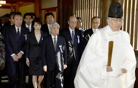 A group of 168 Japanese lawmakers on Tuesday visited the controversial war-link Yasukuni Shrine in Tokyo, which honors Japanese war criminals of World War II.