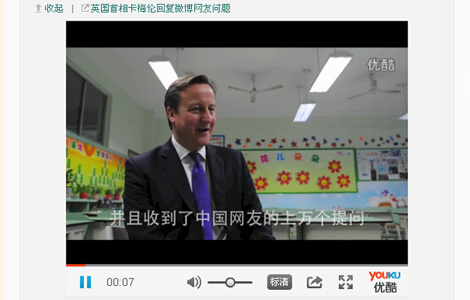 [2013-12-07 21:39]British Prime Minister David Cameron has answered several questions from Chinese netizens through through the Internet and published it on his newly-opened Sina Weibo account.