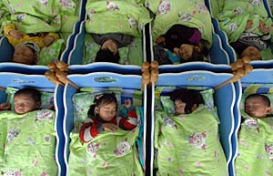 Preschool children sleep in the central kindergarten of Xujia county in Rushan, East China’s Shandong province, on May 10, 2011.