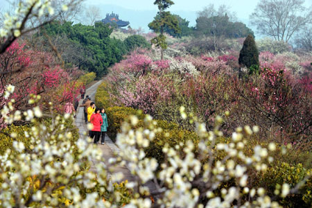 2月20日,游客在南京梅花山景區(qū)賞梅。 當(dāng)日,“2009中國(guó)南京國(guó)際梅花節(jié)”在南京梅花山景區(qū)開(kāi)幕。位于南京東郊的梅花山是我國(guó)四大賞梅勝地之一,這里占地面積400余畝,擁有230多個(gè)品種,近4萬(wàn)株梅花。目前賞梅漸入佳期。 新華社記者孫參攝